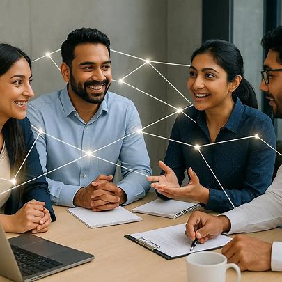 Group of professionals in collaborative meeting demonstrating entrepreneurial performance through teamwork and networking, with a visual network of connections surrounding them.