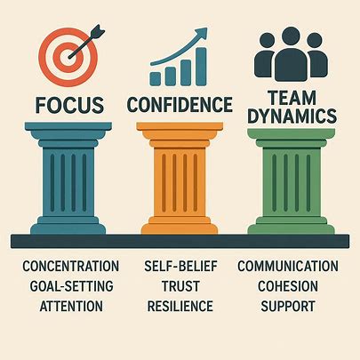 Pillars of focus, confidence, and team dynamics illustrating key elements of entrepreneurial performance such as concentration, self-belief, and effective communication skills.