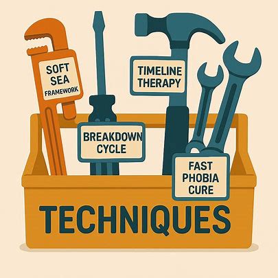 Toolbox labeled Techniques containing tools symbolizing entrepreneurial performance methods such as Soft Sea Framework, Timeline Therapy, and Fast Phobia Cure.